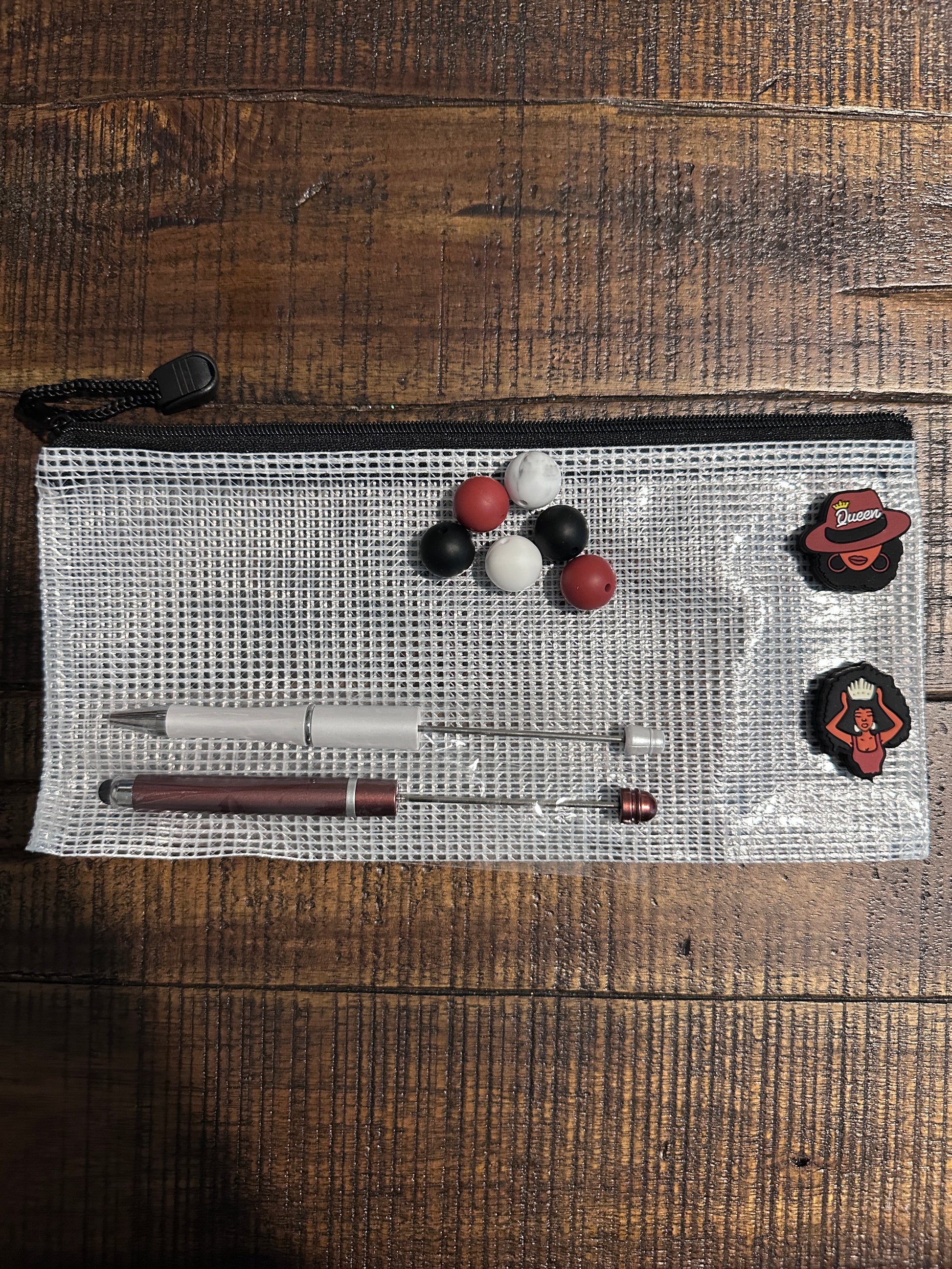 Each set comes with two pens or a stylus and a pen. It includes two focal beads and at least six additional beads to make two pens. All items come in a cute pouch that is color coded with the theme of the two focal beads.